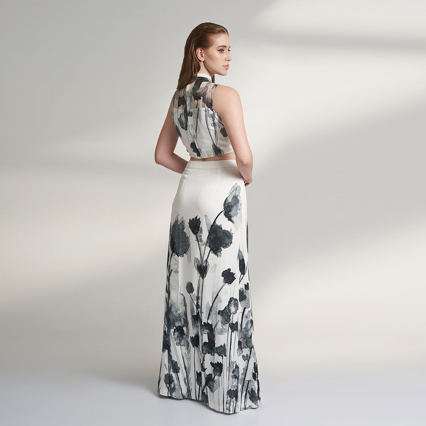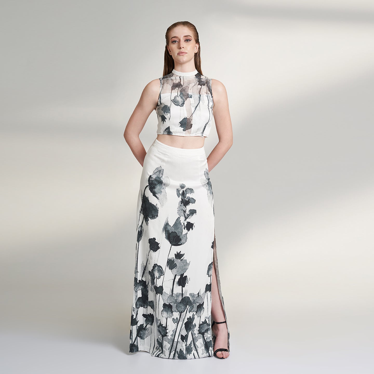 This skirt elegantly features a floral print that infuses a modern touch into the wilderness inspired pattern. Made from white and black Lotus stem fabric, it flaunts a long A-line silhouette, elevated by a daring thigh-high front slit, adding a touch of allure. Combine it with other pieces from our antique reminiscence collection for a harmoniously coordinated seasonal ensemble.
